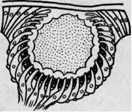Его световоспринимающие концы обращены к свету, нервные волокна собраны в широкий рыхлый тяж, который можно считать примитивным нервом. Наружная часть глаза имеет форму ямки, выстланной сверху покровным эпителием. Глаз кольчатых червей еще более сложен (рис. 4).