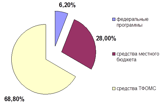 Лекарственное обеспечение Туруханской МЦРБ осуществляется за счет средств местного бюджета и территориального фонда обязательного медицинского страхования, большую часть из которых составляют средства ТФОМС. В рамках целевых федеральных программ по социально значимым заболеваниям лекарственное обеспечение осуществляет Минздравсоцразвития Российской Федерации как федеральный орган исполнительной власти в области охраны здоровья граждан. Структура финансирования лекарственного обеспечения Туруханской МЦРБ представлена на Рисунке 4.